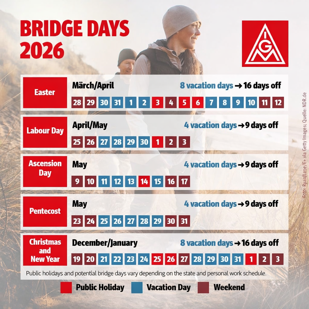 Übersicht der IG Metall zur optimalen Nutzung von Urlaubstagen rund um Feiertage. Hinweis: Feiertage/Brückentage können je nach Bundesland abweichen.