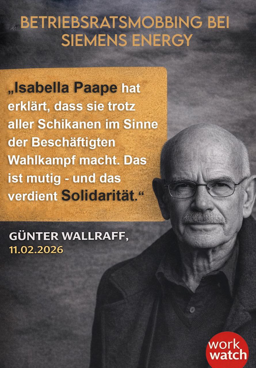 Originalwortlaut (als Bild): „BETRIEBSRATSMOBBING BEI SIEMENS ENERGY – ‚Isabella Paape hat erklärt, dass sie trotz aller Schikanen im Sinne der Beschäftigten Wahlkampf macht. Das ist mutig - und das verdient Solidarität.‘ GÜNTER WALLRAFF, 11.02.2026“